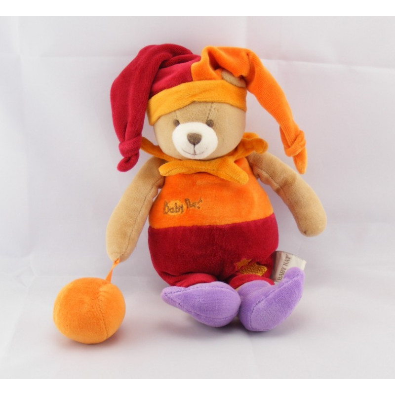 Doudou hochet ours arlequin rouge orange balle BABY NAT LOT DE 2