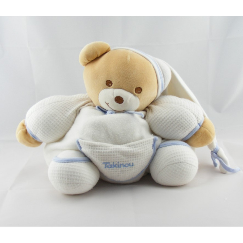 Doudou ours boule blanc bleu poche TAKINOU30 cm env.
